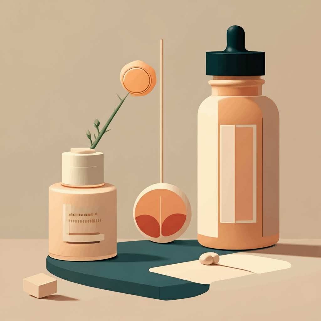 Quatre routines bien-être symbolisées par des objets naturels : digestion, énergie, silhouette, équilibre féminin.